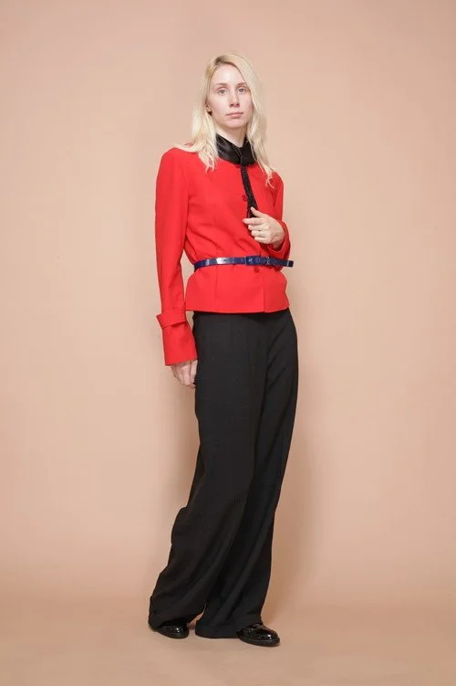 Kroj: jakna kratka, strogo oprijeta, ¾ rokavi, globok V izrez, simulacija šal-ovratnika na prednjem delu. Enoredno zapenjanje z 1 oblečenim gumbom v pasu.